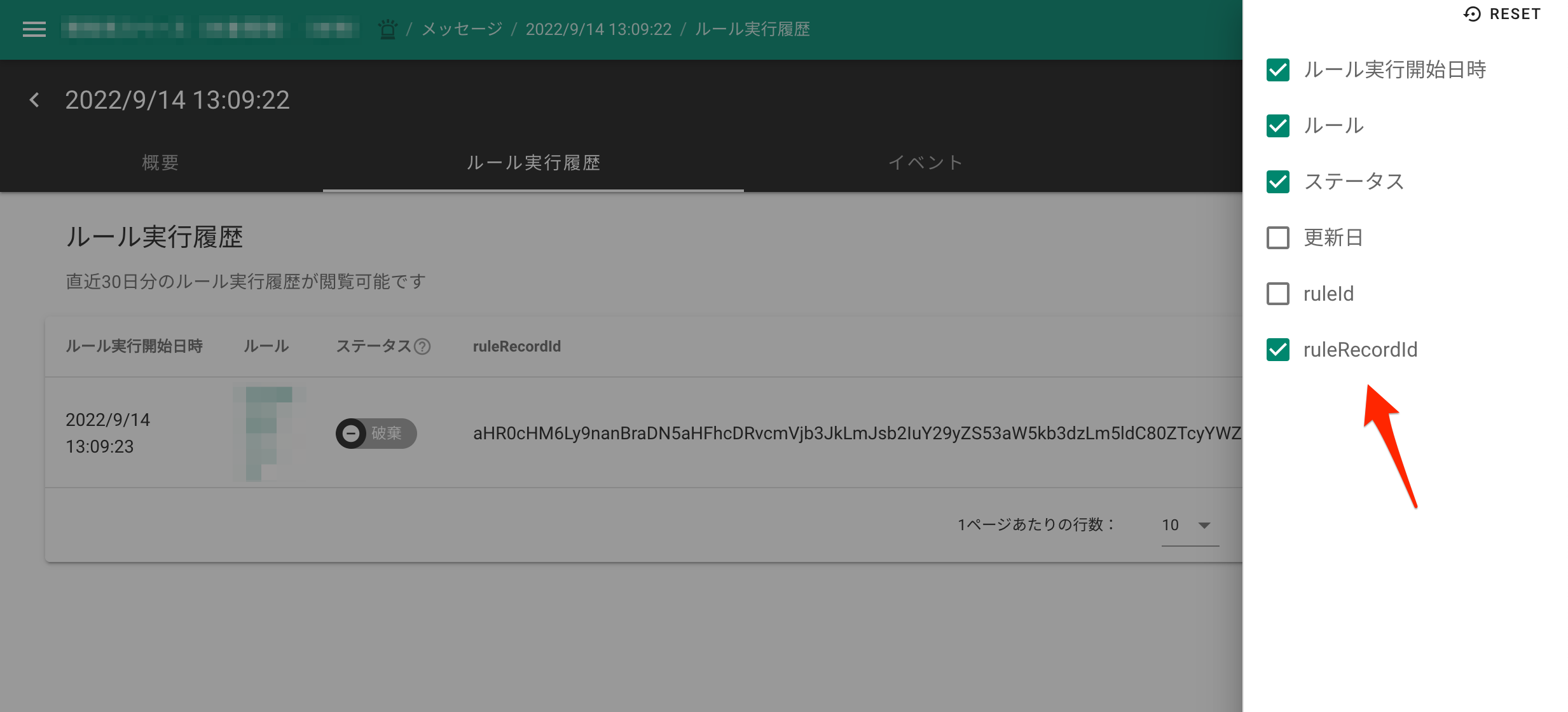 ruleRecordId はメッセージ詳細 > ルール実行履歴画面にあるテーブルの隠し列から確認できます。