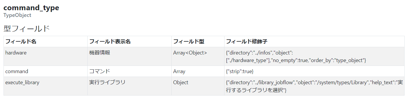 directory フィールド修飾子の指定先は、ディレクトリオブジェクト、もしくは、テーブルオブジェクトのどちらかである必要があります。ところが、{"directory":"$[command_info][hardware]"} の指定では、指定先がhardware_type オブジェクトの配列になってしまっているため、うまく動作していないものと考えられます。