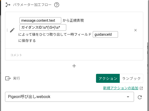 この例では{{guidanceId}}の部分がそれに当たります。- このアクションを呼び出すトリガーのパラメーター加工フローに、メール本文からガイダンスIDを取り出す設定を追加します (パラメータ加工フロー参照)