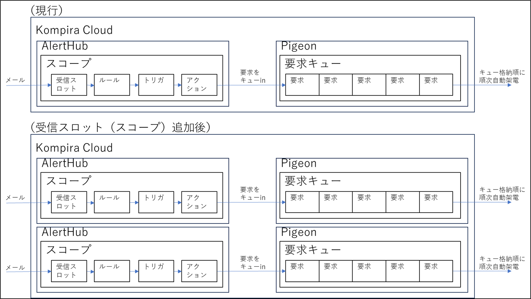 正式なコメント当社からの質問にご回答いただきありがとうございます。メールアドレス数 (受信スロット数) やアクション数は料金に影響はないため、Pigeon 呼び出しアクションを複数用意して、それぞれ呼び出すことができます。そのため、受信スロットとアクションをそれぞれふたつずつ用意して、それぞれの受信スロットの受信を契機に対応するアクションを呼び出す方法を取るのが一番分かりやすい方法だと思います。また、受信スロットも Pigeon 呼び出し Webhook アクションもひとつのまま、ふたつを呼び分ける方法もあります。