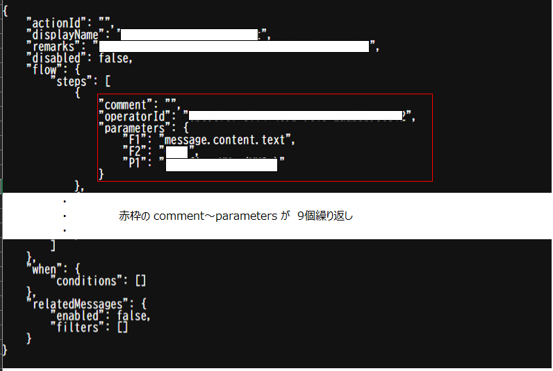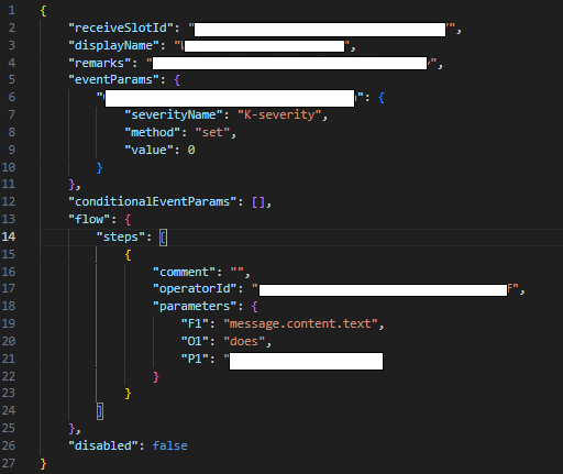 ・17行目:operatorIdは処理フローによって決まった値を設定する必要があります。parametersの内容から推測するに、「フィールドが正規表現にマッチするかどうか確認する」だと思います。