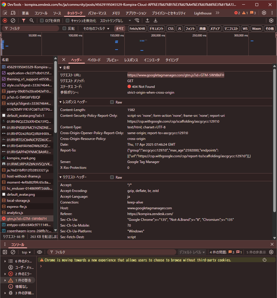 使用しているブラウザはGoogle Chromeですが、同ブラウザの開発者ツールでAPI実行時のネットワークエラーがないかを確認したところ、以下の結果でした。