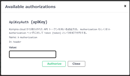 毎回設定している気がしているので、情報を保持する方法がありましたら教示よろしくお願いします。一度設定した後は、設定を解除する操作 (トークン設定ダイアログで Logout を選択) をするか、API ドキュメントページを閉じたりリロードしたりするまでは有効です。