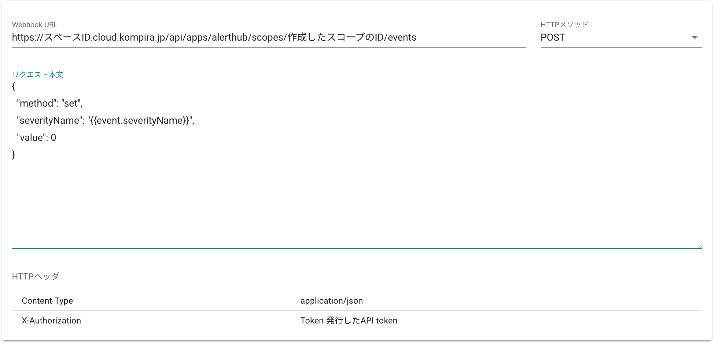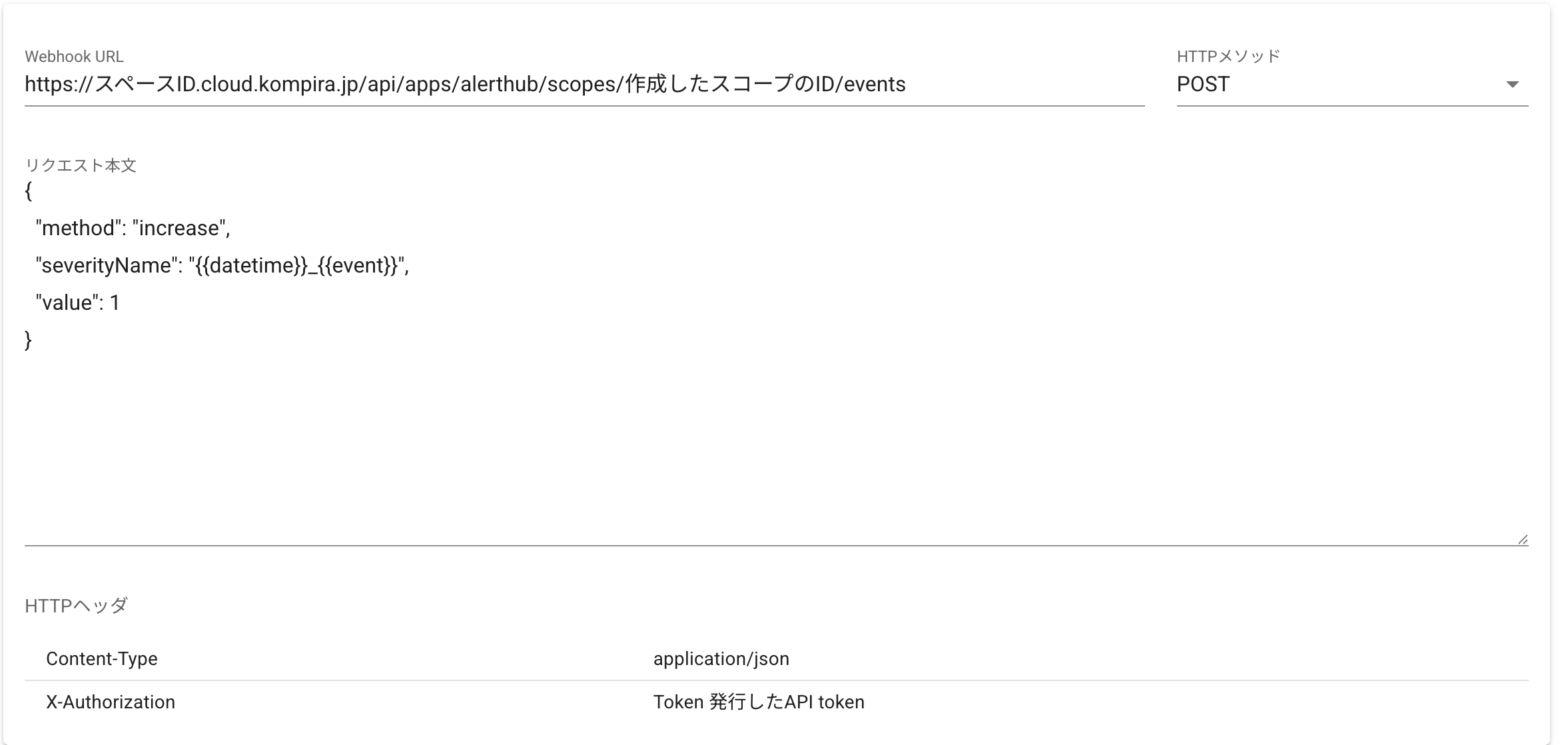 ※1:「発行したAPI token」部分は設定>API tokenから発行したトークン文字列を貼り付けてください。「スペースID」はご自身のものに、「作成したスコープのID」は準備したスコープのものに置き換えてください