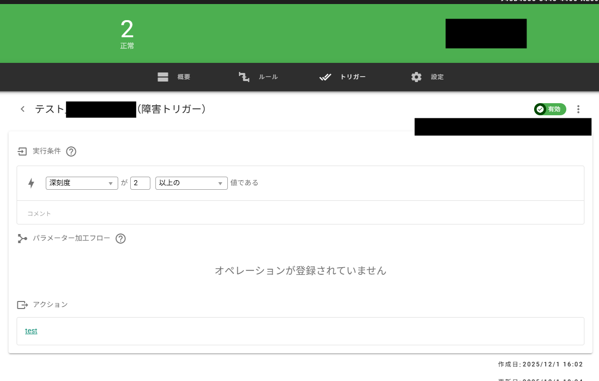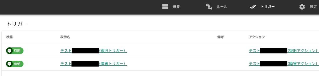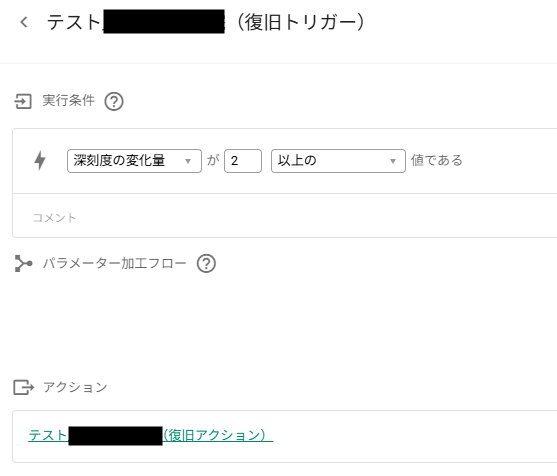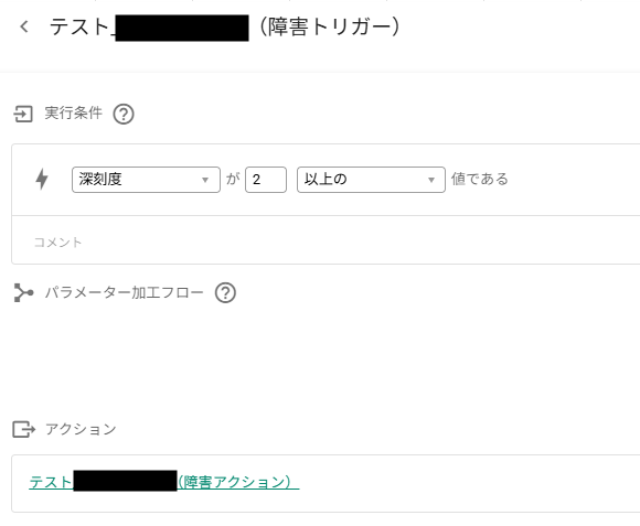 (同じように、ケース①の場合は変化量はそれぞれ1、-1となりますので、こちらも該当しません)2以上の深刻度が0に戻った時に発動させたいのであれば、「深刻度の変化量が-2以下の値である」に設定していただけますと、復旧トリガーが作動するようになると思いますので、一度ご確認いただけますでしょうか。