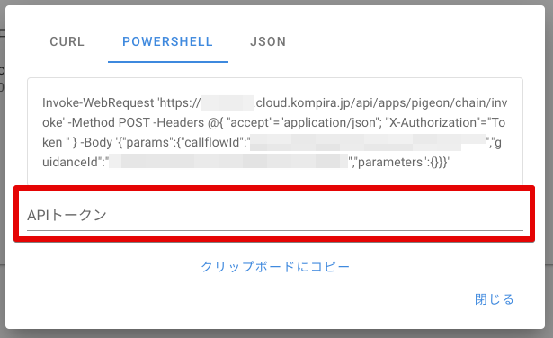 API実行時にはWeb画面上で払い出したAPIトークンをクエリに含める必要があり、コマンドジェネレーターではフォーム入力にてAPIトークンを指定することで、正しいコマンドを生成することができます。
